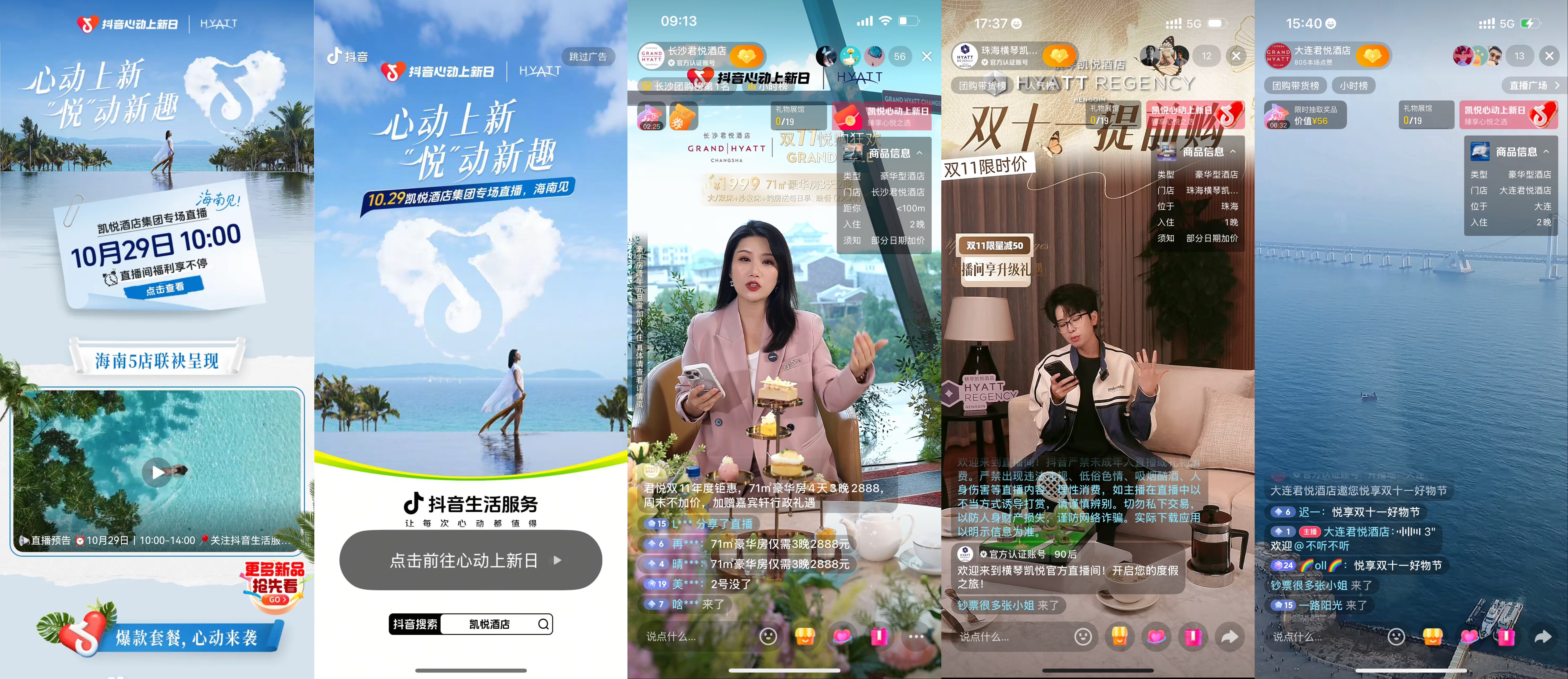 面对这一消费趋势的升级,凯悦集团于2025年10月28日至11月10日期间,携手「抖音心动上新日」IP,开启“心动上新,‘悦’动新趣”主题营销活动。通过独家通兑货盘与沉浸式直播体验的创新组合,为追求品质生活的旅行者打造了一场集趣味与品质于一体的旅居新体验,让用户在内容种草的同时即可完成预订,真正实现“所见即所得”的理想旅居方式。