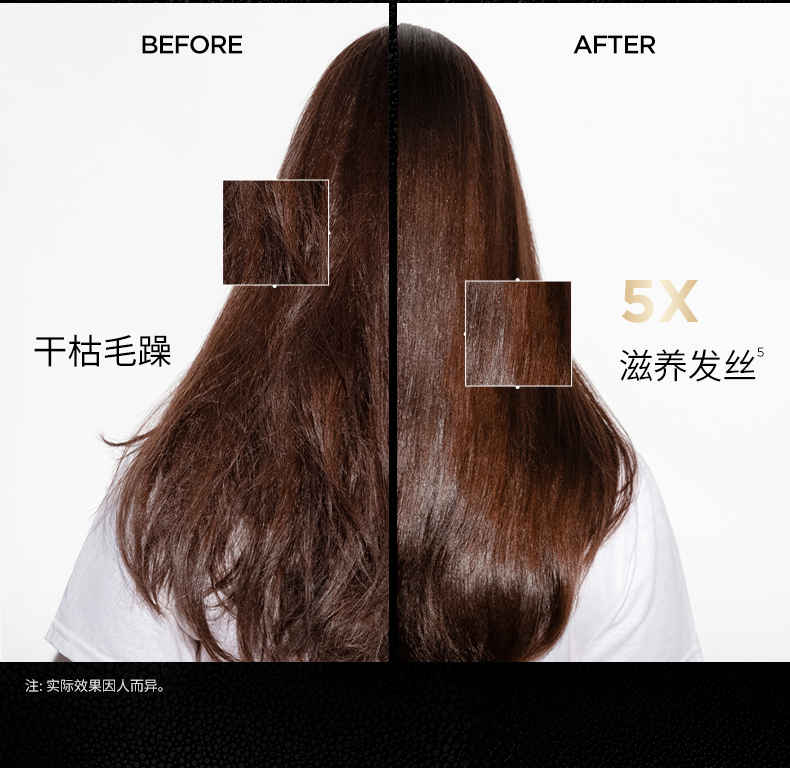 实测可实现 2 倍抗毛躁、9 倍易梳理效果。白色奶霜质地触手即润,洗完发丝自带绸缎光泽。