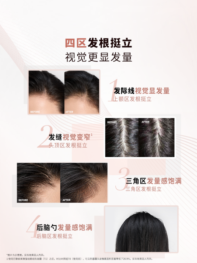- **视觉效果:**93% 的消费者认可秀发更加蓬松,发根支撑力增强,视觉上实现了发量增厚的感官效果。